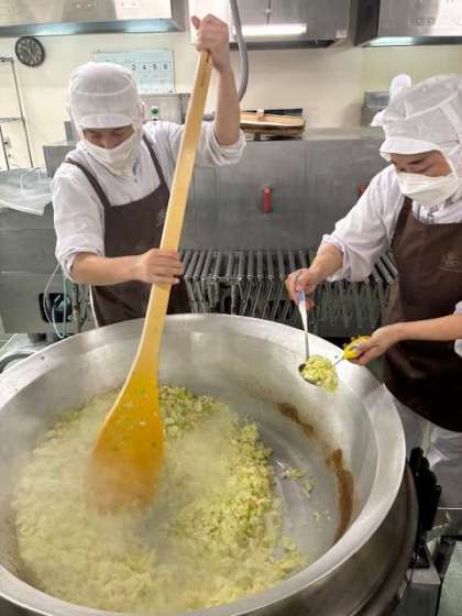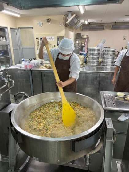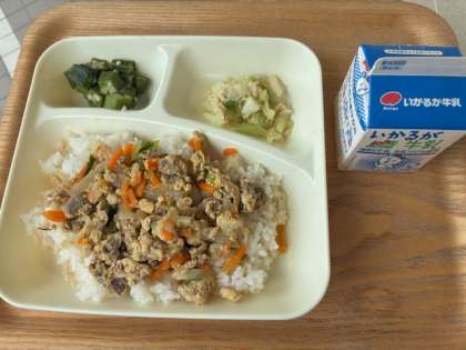 今日の献立の他人丼は、牛肉、鶏卵、たまねぎ、にんじん、青ねぎが入った丼です。他人丼は、卵の除去食対応献立です。
