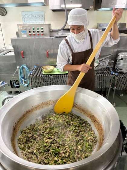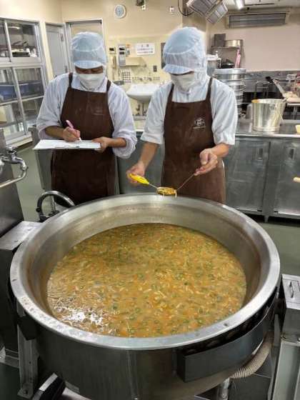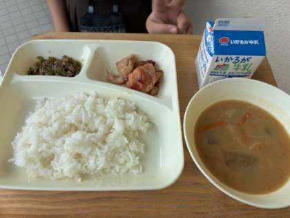 今日の献立のとうがんのみそ汁は、うすあげ、とうがん、オクラ、にんじん、えのきたけが入ったみそ汁です。とうがんとオクラの風味がみそ汁の味をよく引き立てていました。