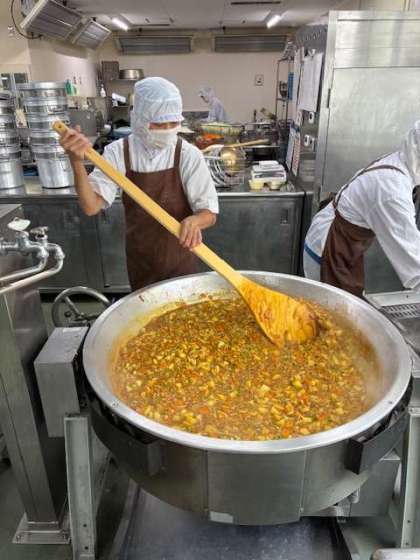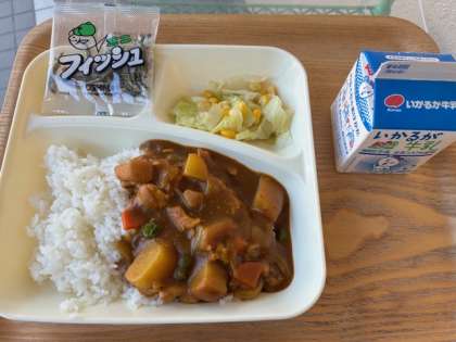今日の献立のチキンカレーライスは、鶏肉、じゃがいも、たまねぎ、にんじん、グリンピース、にんにくが入っています。今日は調理員さんが、ラッキーにんじんを入れてくれていました。