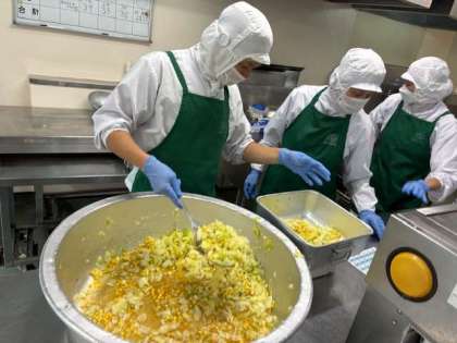 キャベツとコーンのサラダは、キャベツとコーンを焼物機で蒸し、砂糖、塩、米酢、うすくちしょうゆ、綿実油で作ったドレッシングをかけて、あえています。程よい甘味と酸味がカレーによく合う一品でした。