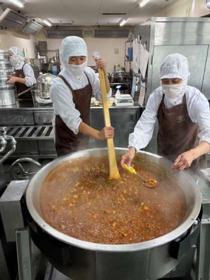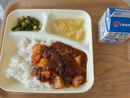 今日の献立のハヤシライスは、牛肉、じゃがいも、たまねぎ、にんじん、グリンピース、セロリ、にんにくが入っています。ハヤシライスの素を使わず、ケチャップ、トマトピューレ、とんかつソース、ウスターソースなどで味付けし、水溶き上新粉を加えて煮込んでいます。