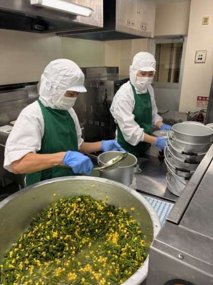 グリーンアスパラガスとコーンのサラダは、焼物機で蒸したグリーンアスパラガスとコーンに、砂糖、塩、ワインビネガー、綿実油で作ったドレッシングをかけてあえています。