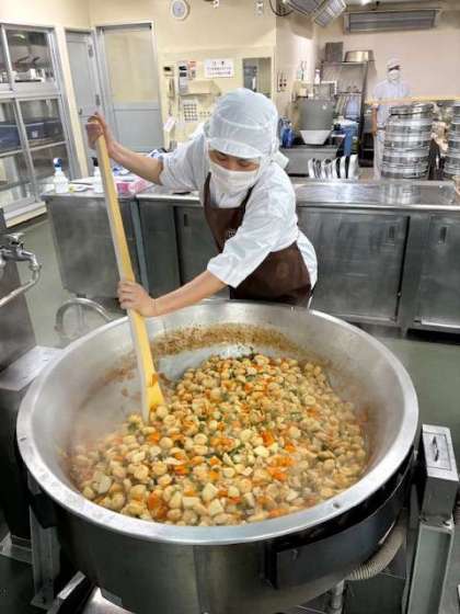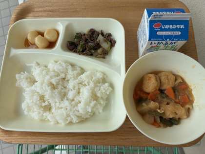 一口がんもとさといものみそ煮は、鶏肉、さといも、一口がんも、たまねぎ、にんじん、さんどまめが入ったみそ味の煮ものです。よく味がしみていました。