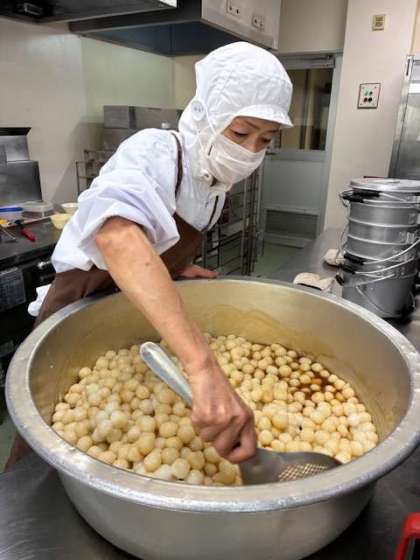 みたらしだんごは、焼物機で蒸したしらたまだんごに、砂糖、こいくちしょうゆ、でんぷんで作ったタレを絡めています。