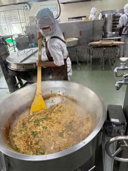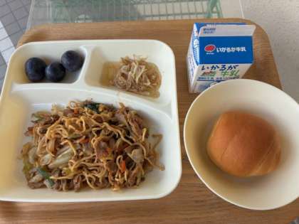 今日の献立のオイスターソース焼きそばは、豚肉、キャベツ、たまねぎ、にんじん、にら、しょうが、にんにくが入った焼きそばです。テンメンジャンやオイスターソースを使っているので、あっさりしているけれどコクを感じる一品でした。