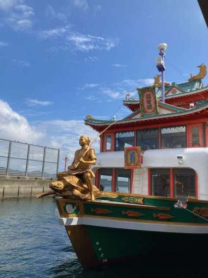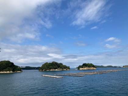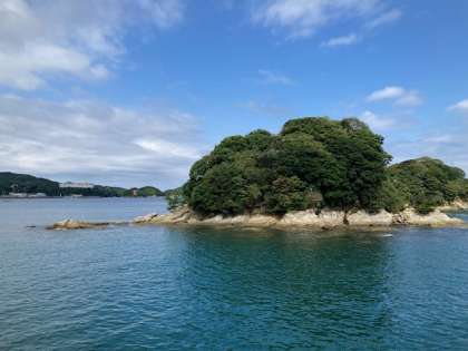 電車で鳥羽駅まで移動して、遊覧船に乗っています。天気が回復し、素晴らしい景色を楽しんでいます。
