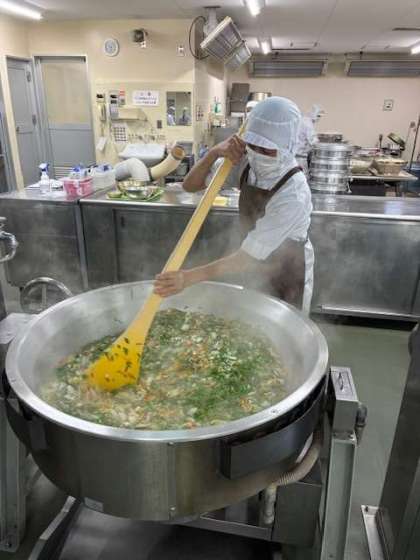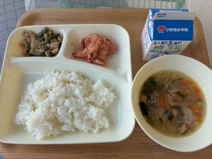 今日の献立の焼き豚のスープは、焼き豚、はくさい、たまねぎ、にんじん、にら、えのきたけが入った中華風のスープです。素材の旨みが感じられる一品でした。