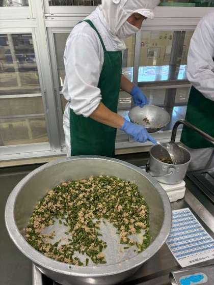 ツナとさんどまめのいためものは、ツナ、さんどまめをいため、塩、こしょう、こいくちしょうゆで味つけしています。ツナが入ることでさんどまめがとても食べやすくなっていました。