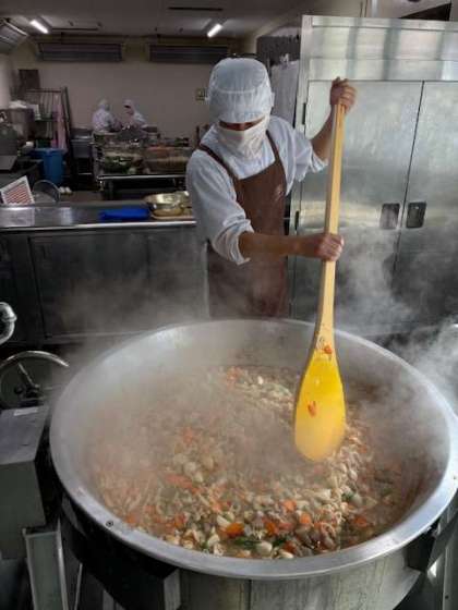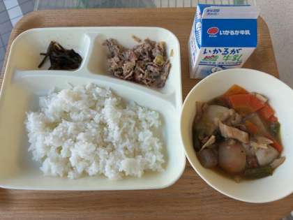 今日の献立のふきよせ煮は、鶏肉、こんにゃく、さといも、たまねぎ、にんじん、れんこん、さんどまめ、しめじが入った煮ものです。『ふきよせ』とは、秋から冬の初めにかけて使われる日本料理の名前です。数種類の煮ものなどを彩よく盛り合わせた料理につけられます。今日のふきよせ煮は素材の味が合わさって、とても優しく食べやすい一品でした。