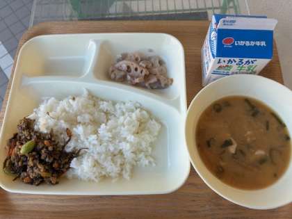 今日の献立のもずくと豚ひき肉のジューシーは、豚ひき肉、にんじん、むきえだまめ、もずく、切りこんぶ、が入った混ぜごはんです。ジューシーは沖縄県の郷土料理で、炊き込みごはんやぞうすいのことを言います。もずくと切りこんぶが入っているのでねっとりとごはんによくなじむ一品でした。