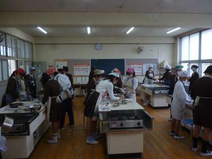 6年生が、小松菜を使って「ゆでる」「炒める」の調理をしました。