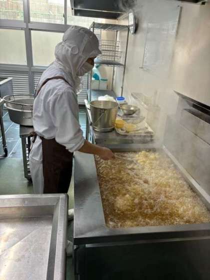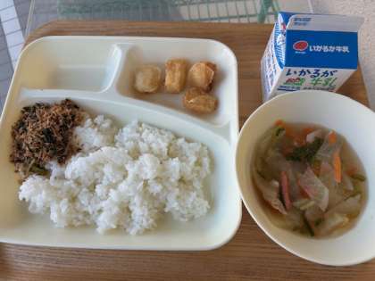 今日の献立のいかてんぷらは、角切りのいかてんぷらを170度のなたね油で揚げています。衣はカラリと揚がり、中はふっくらとしていてとてもおいしい一品でした。