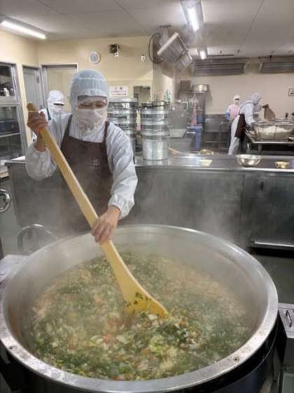五目汁は、鶏肉、はくさい、だいこん、にんじん、青ねぎが入っています。だしこんぶとけずりぶしでとっただしと具材の味が合わさって、とてもおいしい一品でした。