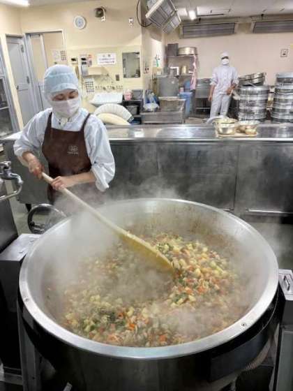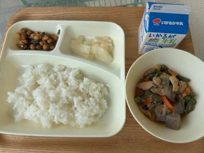 今日の献立の鶏肉と野菜の煮ものは、鶏肉、じゃがいも、こんにゃく、たまねぎ、ごぼう、にんじん、さんどまめが入った煮ものです。けずりぶしと具材の味が合わさって、とてもおいしい一品でした。