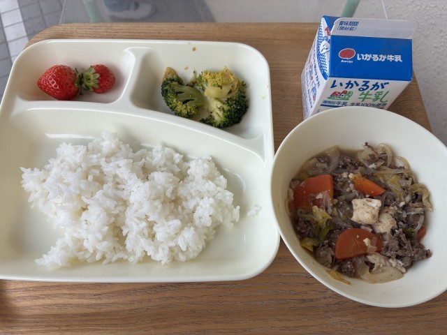 今日の献立のすき焼き煮は、牛肉、糸こんにゃく、とうふ、はくさい、にんじん、白ねぎ、まいたけが入っています。とてもボリュームがありました。1年生の児童からとても楽しみにしていたと教えてもらいました。