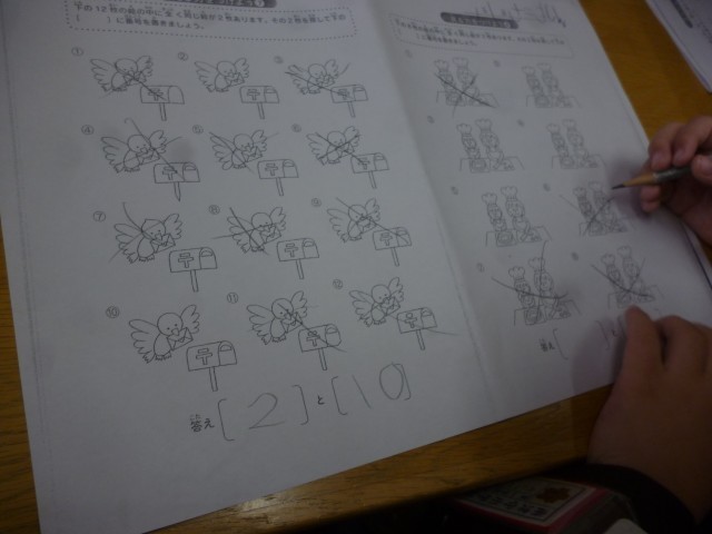 この日は、たくさんある絵の中から「同じ2枚」を探し出す問題に取り組みました。一見よく似ている絵ですが、細かな違いに目を向けながら、真剣な表情で考える姿が見られました。
