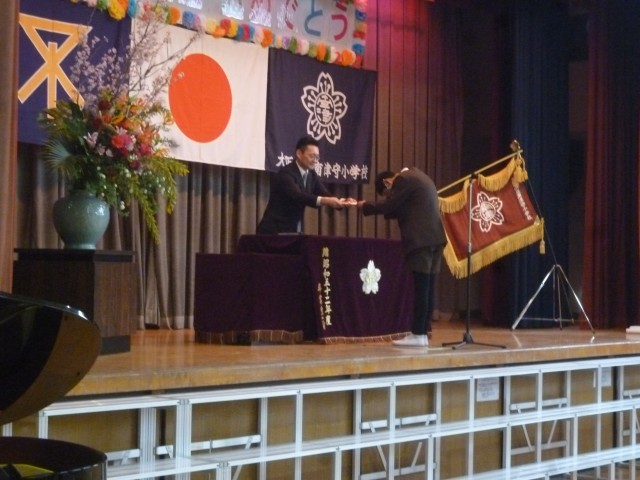 5年生の代表児童が、修了証をしっかりと受け取り、1年間の締めくくりにふさわしい姿を見せてくれました。