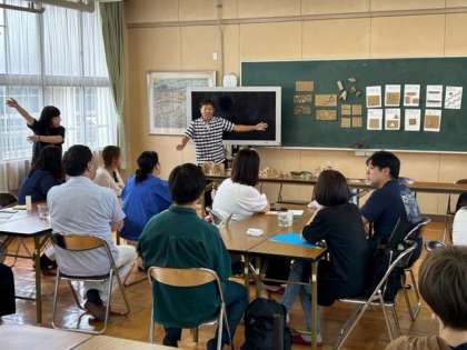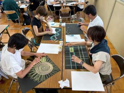 この日は、低学年部・中学年部・高学年部がそれぞれ題材を持ち込み、子どもたちと同じように材料と触れ合いながら、その材料が持つ可能性や広がりについて話し合ったり、つくったり描いたりしました。