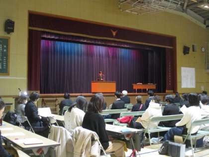 家庭部長のあいさつ、来賓紹介、大領小学校で行った4年生と6年生の実践の報告を行った後、大阪市教育センターの指導主事先生からの指導講評をいただきました。最後に、大阪教育大学の鈴木真由子教授の講演を聞きました。大阪市内から150名を超える先生方が参加し、家庭科教育について学び合う事ができました。