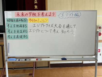 エジプト教育省School Supervisor、水津嘉應先生をお招きして、5年生総合的読解力育成プログラム、「未来の学校を考えよう」が行われました。今回のミッションは、「エジプトの学校や文化について考えよう」で、グループに分かれてクイズを出し合い、エジプトについて知るとともに、考えを交流しました。
