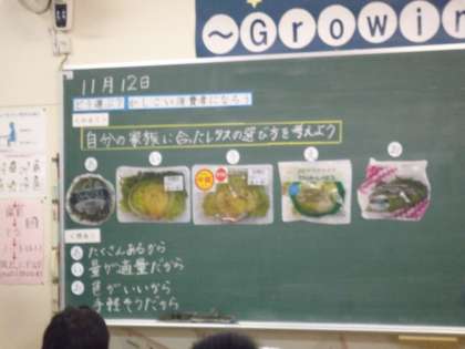 値段・消費期限・色・内容量・100gあたりの値段など、タブレットに送られてきた5種類のレタスの写真を見て調べ、自分の家族に合ったレタスを選ぶ学習をしました。