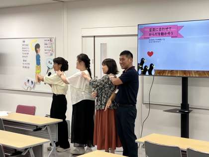 7月29日(火)大阪市総合教育センターにて2年目〜5年目の先生方を対象に基本研修が行われました。先生も子どもも一緒に楽しく音楽に合わせて体を動かしながら、拍感や歌声を磨いてゆけるような常時活動や指導法を今年度は歌唱部から紹介させていただきました。暑い一日でしたが、受講者の皆様のはじける笑顔や笑い声、明るい歌声に私たちも元気を分けていただき、拍を合わせることで生まれる音楽ならではの一体感を味わうことができました。基本研修を受講されて「音楽部の研究たのしそう!」と感じられた方は歌唱部を始め、鑑賞部、音楽づくり部、器楽部でも仲間を募集中です。ぜひご連絡ください♪