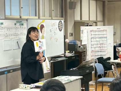 歌唱部会研究授業・研究協議会が11月11日、堀江小学校で行われました。器楽部の皆さんとのコラボやプレ授業を重ねる中で、本時では「音楽の縦と横との関係」に焦点を絞った授業展開を目指しました。子どもたちは、縦と横に着目できるように色分けされた楽譜を見つめながら、本時のねらいにせまる歌い方の工夫を話し合えたようです。授業後、大阪市総合教育センター指導主事、鍬田綾子先生からは、子どもたちの何度も歌って試す姿や、安心して音楽に浸り歌う姿を評価していただきました。また、音楽教育アドバイザー・作曲家・合唱団指導者、古宮真美子講師先生には、本時の授業の成果と課題を明快に整理していただきながら、音楽学習を楽しく進めていくためのあの手この手をご享受いただき、参会の皆様の笑い声と明るい歌声があふれる素敵な時間となりました。古宮先生作曲の「夢への架け橋」を最後に全体合唱して終幕となりました。「追っかけパターン」や「コーラスパターン」など、本時の学びがたくさん生かせる「夢への架け橋」は、聴かせどころもたっぷりな感動的な曲で、卒業式に向けて子どもたちとも歌ってみたくなりました。