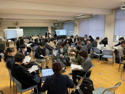 公開授業後の研究討議会では、授業のようすや各校の総合的な学習の時間について活発なグループ討議が行われました。また、奈良教育大学特任准教授の小島亜華里先生にご講評をいただき、授業についてだけでなく次期学習指導要領の方向性についても教えていただき、「質の高い探究」に向けて多くのご示唆をいただきました。
