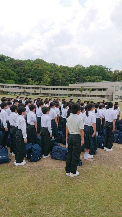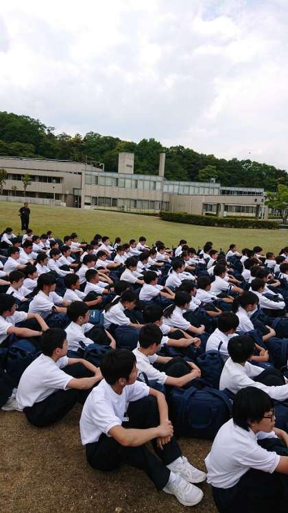 昼食を食べ終わり、入所式が行われました。代表生徒のあいさつの後、学校紹介を兼ねて校歌斉唱。宮津の空に響き渡る、大きな声で歌えていました。