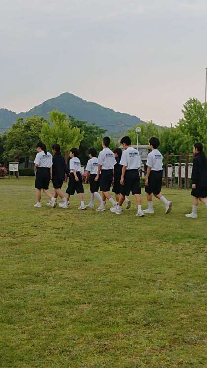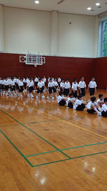 最終日の天橋立ウォーキングに向けて、列を乱さずに歩く練習です。はじめは体育館で、その後雨もあがったので外で行いました。こちらは少し肌寒いです。