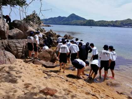 続いて、磯観察です。マリンピアから歩いてすぐの砂浜で磯観察を行いました。まだ冷たい水に足をつけたりしながら楽しい時間を過ごしました。