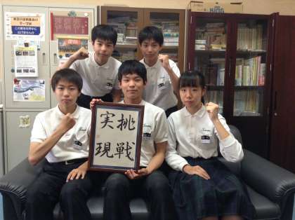 5月23日、中間テスト終了後、生徒会役員5名が校長室を訪れて、今年度の生徒会スローガンの報告をしてくれました。スローガンは『挑戦・実現』です。チャレンジだけでなく全校生徒一人一人のために、色々な事を実現していくことにもこだわると。今後予定されている校長先生とのトップ会談にも意欲満々です。頼もしい限りですね。