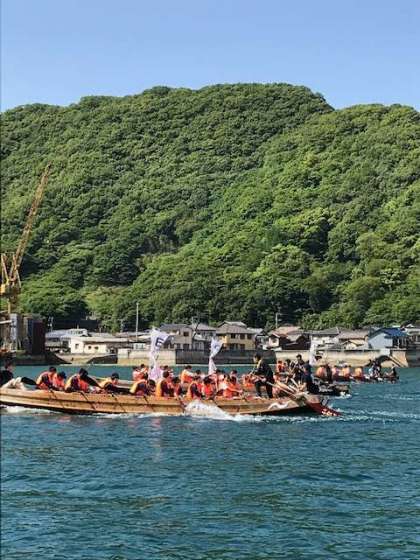 島伝統の櫂伝馬競争の体験です。何と言っても醍醐味はクラス対抗のレースです。