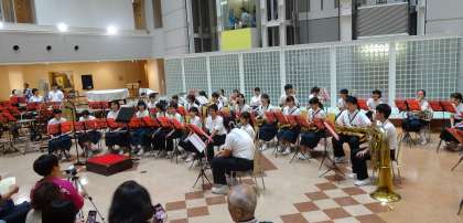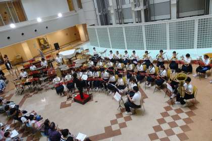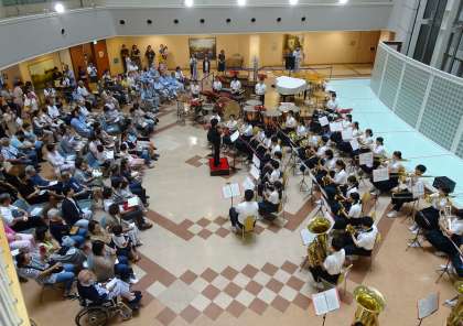 夏休み最後の平日昼下がり、北野病院で本校吹奏楽部によるふれあいコンサートが行われました。入院されている方や地域の方、保護者の方など100人以上の方が来られていました。約1時間の美しい演奏は、心も体も癒してくれる優しい音色でした。