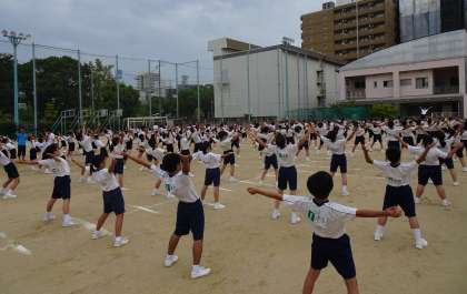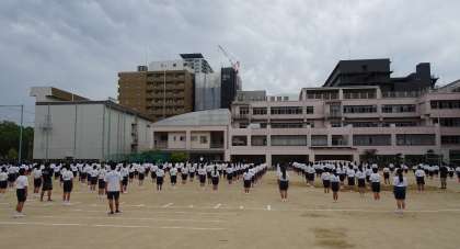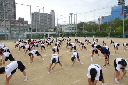 練習の後半はラジオ体操です。プログラム1番で、全校生徒で行う団体演技です。あと2週間の練習で400人の息がぴったりと合うでしょう。