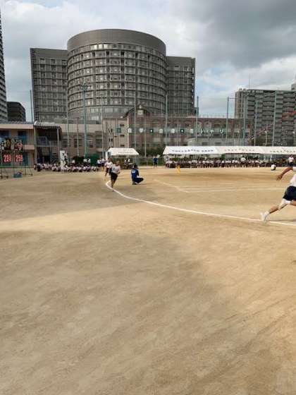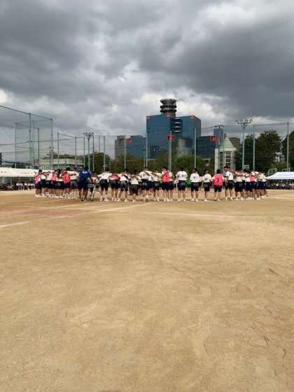 体育大会のクライマックス、3年生の全員リレーです。スタート前は全員で円陣を組んで健闘を誓いました。