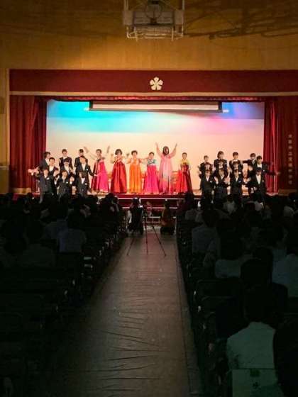 夜間学級の発表と昼の生徒とのコラボです。手話を交えながら「花は咲く」を歌っています。この舞台発表は天満中学校ならではです。