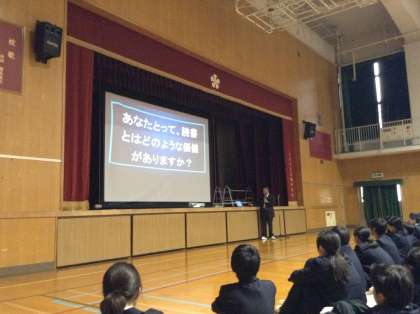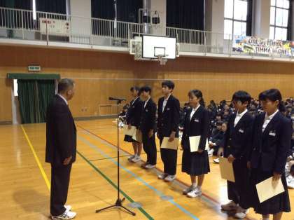 10月29日、体育館で後期の認証式があり、その後に家庭科部の表彰が行われました。校長先生からは、学力向上には読書が効果的であるという新聞記事の紹介があり、本校では読書の習慣化ができていると答えている生徒は、全体の70%弱であると。今後はこの数値を超えることを期待しているとお話を締めくくりました。合言葉は、週に一度は図書館へ。