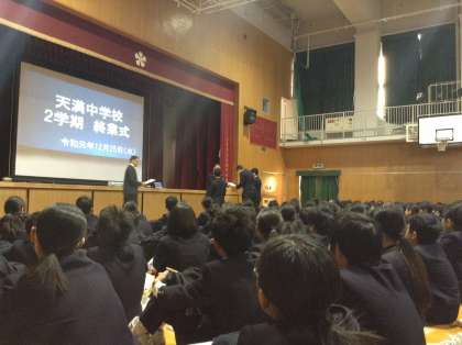 12月25日、体育館で2学期の終業式が行われました。最初に校歌を斉唱し、続いて表彰式があり、校長先生のお話がありました。本校の目指す子ども像、校内生徒アンケート結果の考察、そして今学期一番の映像として3年生の全体合唱の様子が映し出されました。ここで新たに生まれた言葉が「ONE TEMMA」であると。最後にPTAの協力のもと体育大会の記念クリアファイルの紹介もありました。来年度はさらにレベルアップを図るために皆さんは何にチャレンジしますか。常に前に進む天満中生であってほしいですね。地域、保護者の皆様、今年も天満中の応援団としてご支援ご協力いただきましてありがとうございました。2020年もよろしくお願いします。