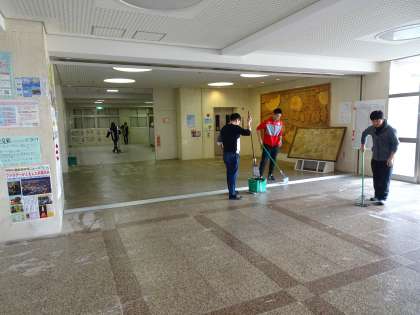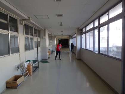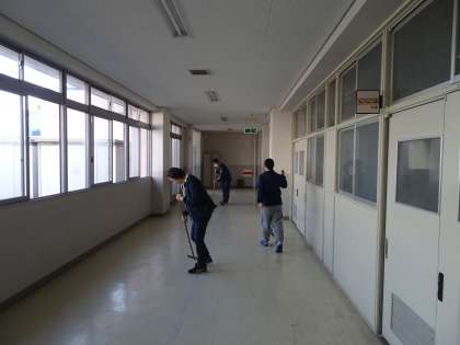 休校中の生徒のいない学校ですが、廊下のゴミがたまってきていました。普段は全校生徒で行っている清掃を教職員で行っています。授業再開に向けて、学習環境を整えています。