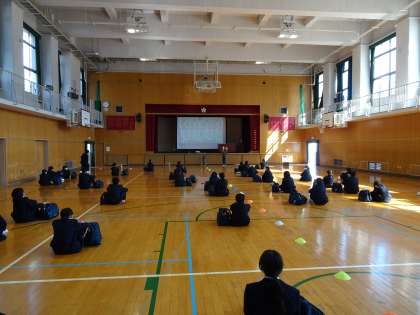 今日が教科書給与等のための登校日でした。体育館では間隔を十分にとり、出席番号順に座っています。