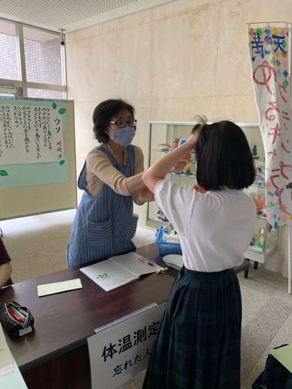 そろそろ偶数クラスが登校してきます。玄関では無接触体温計で検温ができるようにしています。