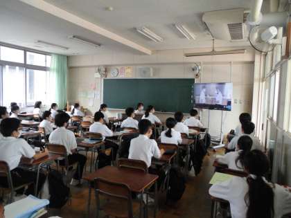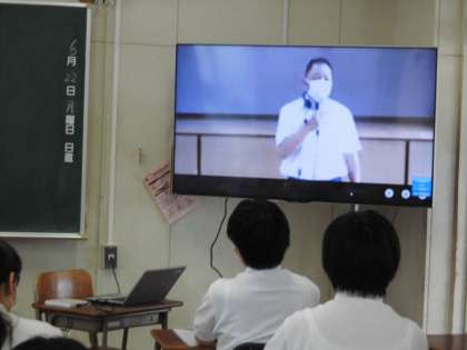 1年生の各教室には体育館の認証式の様子がリアルタイムで送信されています。