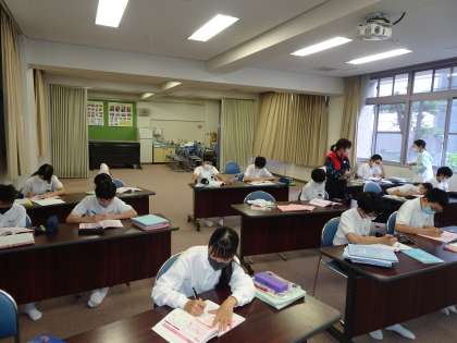 文法の授業を二分割して20人弱で行っています。先生はスクリーンにワークシートを映し、タブレットを使って全体に説明をしていました。少人数なので、分からないところをすぐに先生に質問し、教えてもらっている姿も見れました。