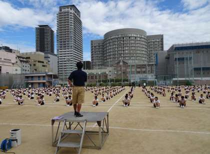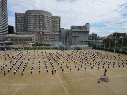 午後から雨予報のため、1・2時間目に繰り上げて行っています。今年の体育大会は例年と異なり、午前中のみの短縮バージョンのため入場行進はありません。1時間目は心構えや意気込みについて、体育委員長から話がありました。その後、体操隊形に広がる練習などをしています。