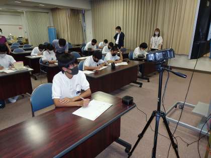 通信アプリ「Teams」を使い、2年生を対象に東京にいる講師の先生が数学のリモート授業をしてくださいました。後半は自習タイムで、問題集の分からない箇所を画面越し質問していました。このような学習会はまだまだ研究段階で、中身をブラッシュアップしながら天満中学校・大学・地域が連携して進めていく予定です。