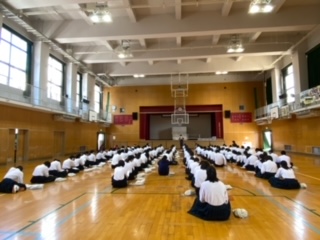 明日からの修学旅行に向けて全員揃って事前指導をしています。