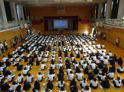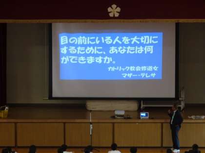 校長先生の講話では、教育目標の1つである「思いやり」についてのお話がありました。タイのテレビCMを生徒たちは真剣に見ていました。