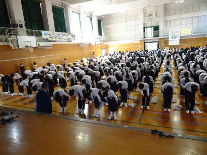 今日から3年生が登校し、朝は2週間ぶりの全校集会を行いました。できる限り密を回避するため、今回から並び方を変更しました。おかげで、体育館のスペースを有効活用し、今までより間隔を空けて整列できました。