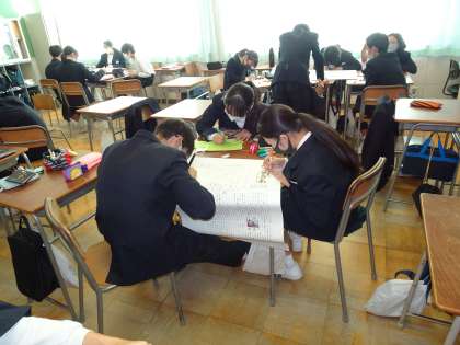 明日は文化活動発表会です。感染症拡大防止の観点から、今年は内容を縮小して行います。各学年では展示物の準備に追われています。写真は2年生の海外調べ壁新聞を作成している様子です。